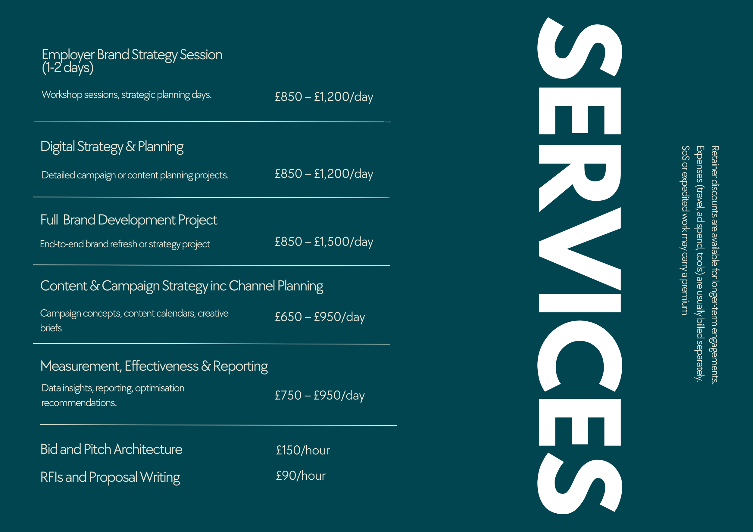 Brand Frank will provide services including but not limited to brand consultancy, creative strategy and development, content creation, digital strategy, social media management, campaign execution. Solution architecture and proposal management and bid writing. Restaurant concept, design and operational readiness and interim cover detailed in the project brief or proposal.